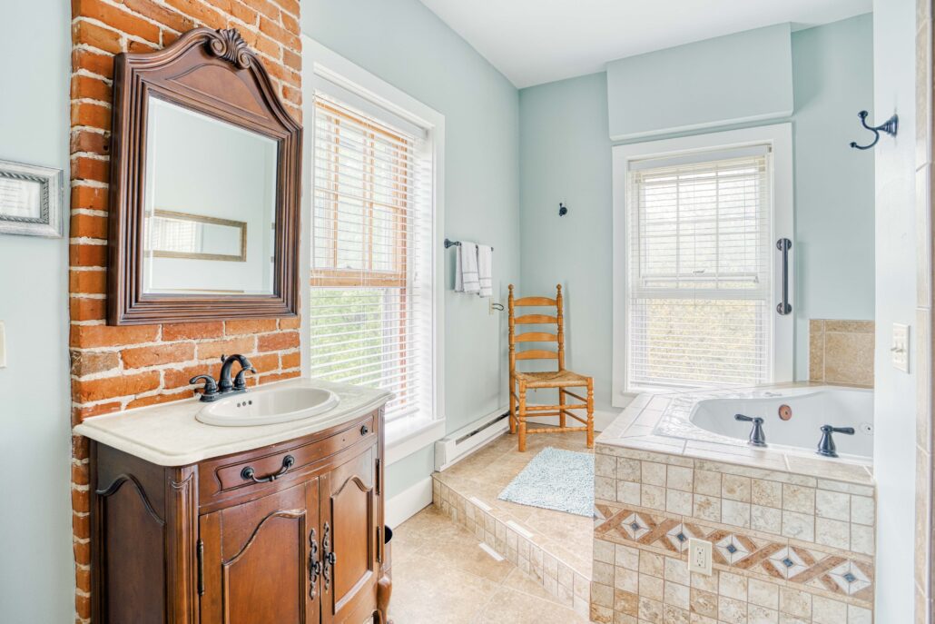 The private bathroom has both a shower and a jacuzzi tub.