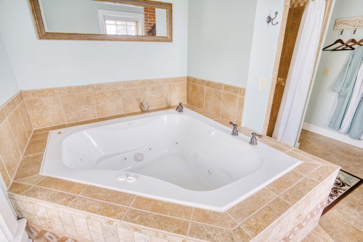 The private bathroom has both a shower and a large jacuzzi tub.